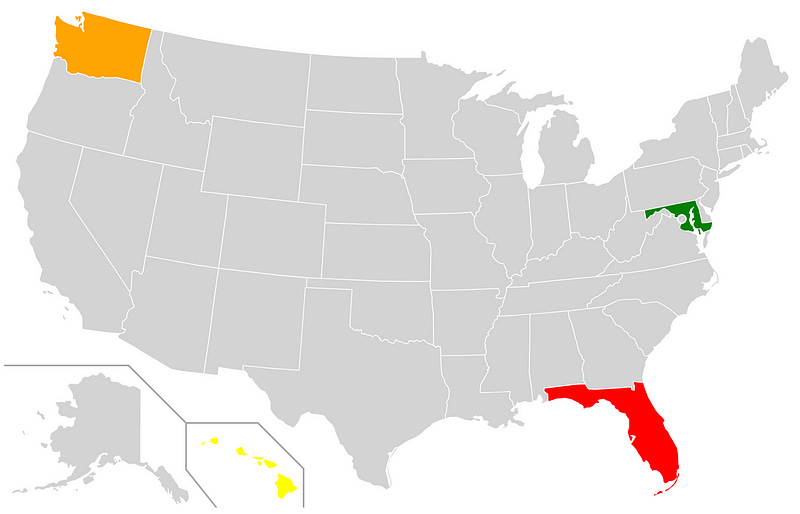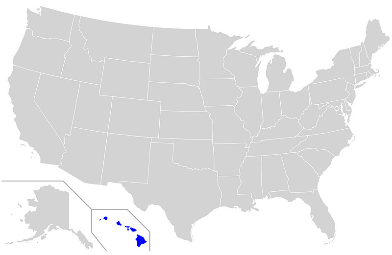 }setColorFor('HI');At this point, Hawaii should turn yellow — this makes sense because our data says that Hawaii has ≥ 500 cases. However, all the other states in the dataset are still grey.