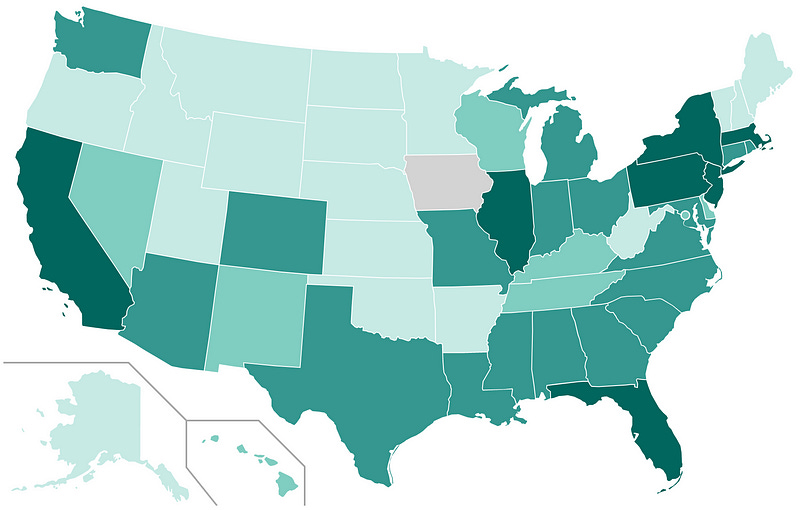 Suppose we are using this map to visualize the extent of coronavirus cases in the United States. Let’s make up some numbers and see what a subset of this data would look like: